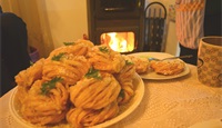 The traditional Kilani “glydjista” are a type of dessert made of strands of pastry interwoven in a braid that are fried and dipped in syrup. They are then sprinkled with sesame seeds and decorated with scented geranium [Pelargonium]. Many of the village customs are associated with the production of “glydjista”: