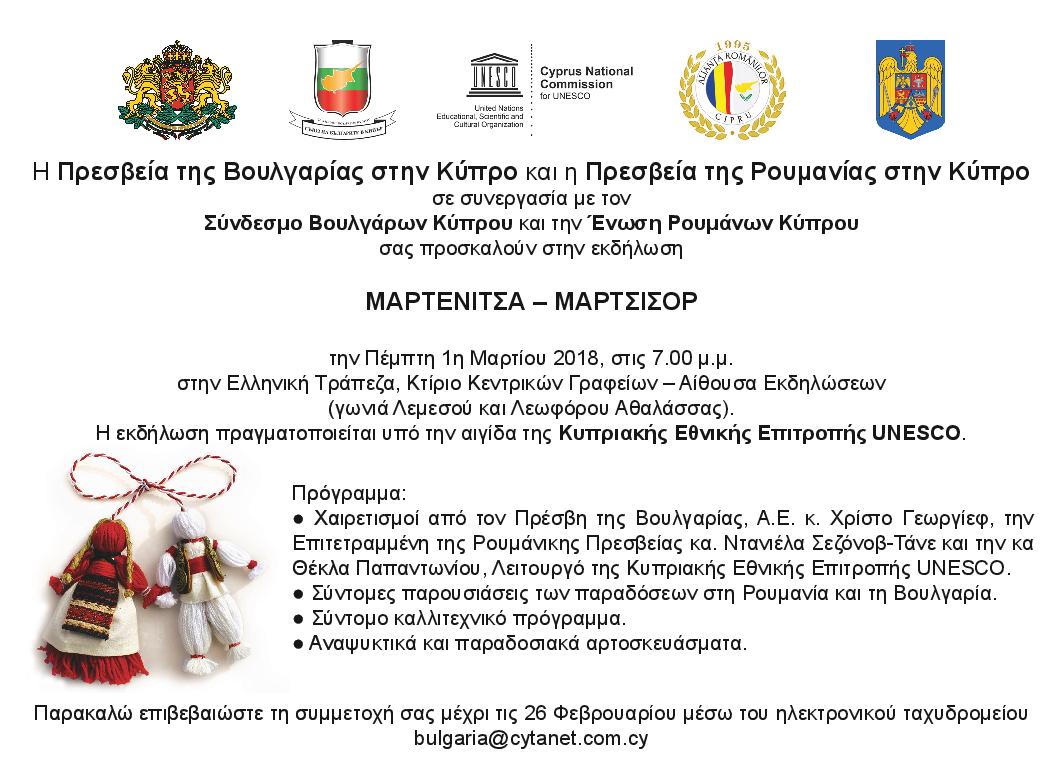 Η Πρεσβεία της Βουλγαρίας και η Πρεσβεία της Ρουμανίας στην Κύπρο διοργανώνουν εκδήλωση σχετικά με το έθιμο της 1ης του Μάρτη “Martenitsa /Mărţişor”, την Πέμπτη 1η Μαρτίου 2018, στις 7.00 μ.μ., στην Ελληνική Τράπεζα, Κτίριο Κεντρικών Γραφείων – Αίθουσα Εκδηλώσεων. Η εκδήλωση πραγματοποιείται υπό την αιγίδα της Κυπριακής Εθνικής Επιτροπής UNESCO και σε συνεργασία με τον Σύνδεσμο Βουλγάρων Κύπρου και την Ένωση Ρουμάνων Κύπρου.